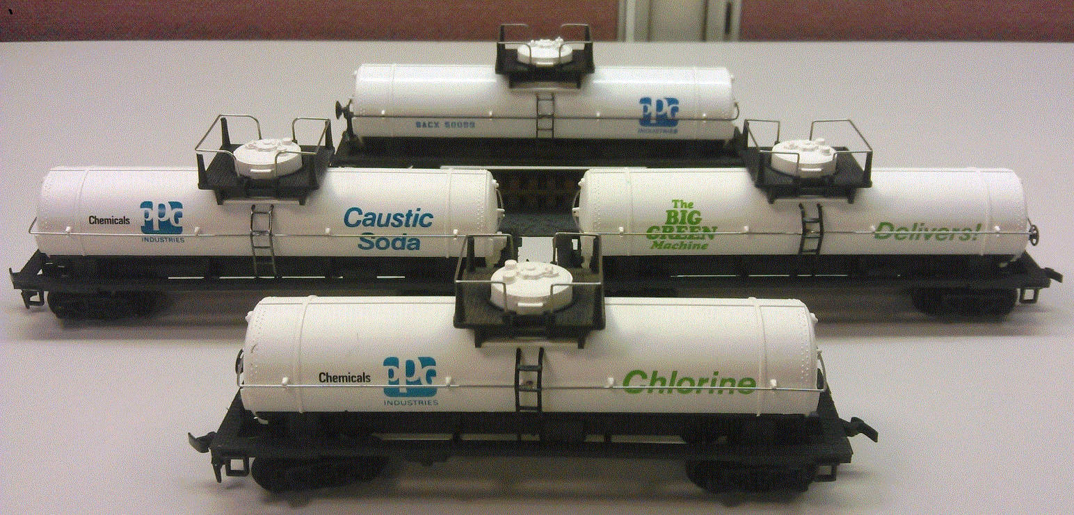 I have been trying for a while to get all four of the PPG tankers and now I finally have them. The one I thought would be the hardest turned out to be the easiest, it's the one in the back, I think it was an employee car with the section of track on the bottom. Our favorite zombie chick sold me that one a few months ago. All I need now is a PPG Plymouth Industrial Switcher, anyone have one for sale?