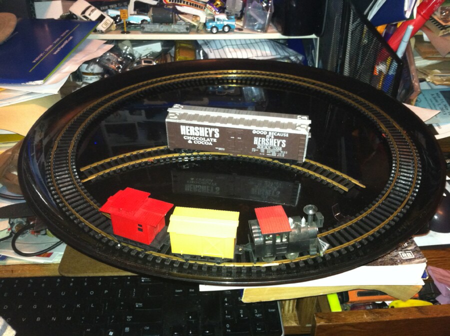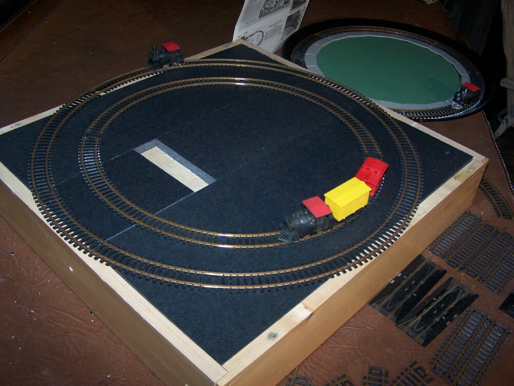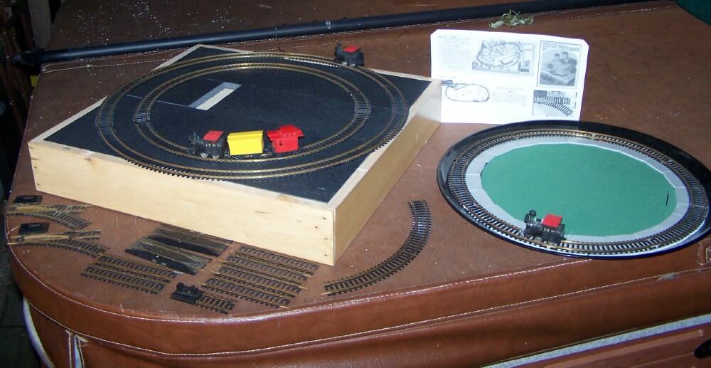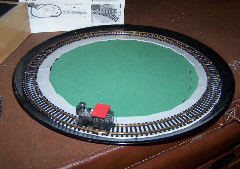 thanks to some recent searches, and 59Chevy held off bidding on a 4th bag of track I managed to acquire enough pieces of vintage Eldon track to complete a tight circle. And I mean TIGHT, this diameter in the picture is 16 inches between the outside rail. I assume that's an 8 inch radius! But for this Eldon train, that is perfect. Here's a picture of the Eldon Little Big Train on Eldon tight radius track, with a standard Tyco HO boxcar in the middle on a 5th piece of track. The rest of the track lot was standard 18" radius stock. I found that this eldon circle will fit on food platter tray. I may leave it permanently set up on it like this. Will have to put new rubber bands on this engine, they dried up and broke off while arranging for this picture. A video will be made eventually of this train running.