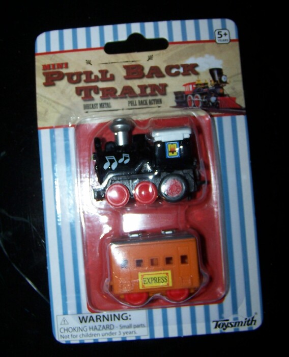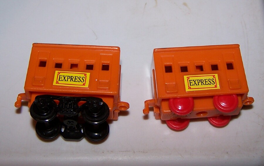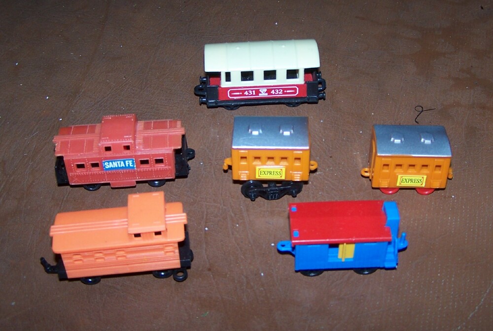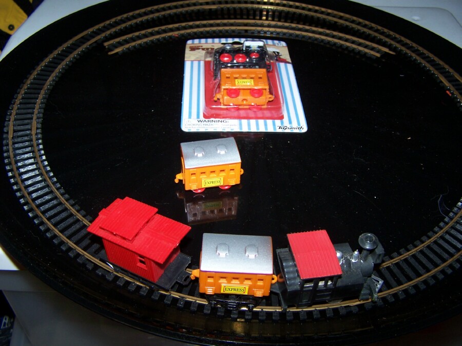 I found these little pullback friction trains at Toys R Us, and decided to try to make a Paassenger car work with the Eldon set. I took one to work today, and was able to mount an HO truck easily The center "beam" area is hollow, so I THINK I can even mount some Kadee couplers in there after I open a slot at each end! and add some extra weight, too. While they may not be prototypical, they are similar in size to the Eldon set, slightly smaller, and with just 3 passenger cars and the locomotive, it would look OK I think. Here's a few pictures I took of my effort once I got home from work.