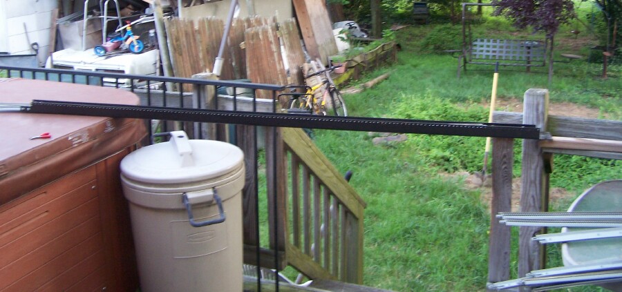 Anyway, one issue with the C channel was width. I thought about using flex-track, but decided, being an outdoor railroad, that I would use EasyTrack by Bachmann for ease of set-up and tear-down. It will be a modular removable layout hanging off the outer edges of the deck railing. My goal is to have an L-shaped "layout", but will probably start off with a Dogbone style to get it up and running quickly. That said, the Easytrack was slightly too wide with both pieces in the channel. I needed a router for plastic. I hit on something at work, we have a small drill press, and I also have used Roto-Zip bits to cut plastic parts. I thought, hmm, all I need is a backstop to slide the track against, and it should be stable enough to rout the edge. I had an L-shaped 2 foot metal support bracket that was 1/4 inch thick, so would not give. I C-clamped it to the drill press at one end, pivoted the bracket until the track was just getting notched about 1/16th of an inch. Then I locked down the C-clamp and zipped away! Worked as well as I'd hoped, I just took it slow, and doing the 36" long pieces I'd bought at my LHS, I did 3 at first, took them home, and trial-fit them. I was hoping I'd only have to do one track side, but looked like it would need 1/8th off total. So , when I flipped another one around with the routed edges outward, the pair fit fine. Ok, have to mill them ALL now, not just half. Took the other 9 pieces to work, and got them done this week during slack time and break. Tonight is my first set-up attempt. I improperly braced the "bridge", and while I was trying to put the loop on, it slid off the brace, tilted up, and crashed to the deck. Bent up 4 of the rail joiners. BOTHER! said Pooh-man. Got out 4 more straights, and this time pulled the bridge over to the railing and it had a secure set point. Back to the loop. Got it set in place, and hooked it all up. Nice! I won't be running it on the hot tub, I intend to run it on the outside of the railing, but since I COULD, I may come up with a method to run it across the deck table as well. But it would be out of the way on the outside railing, and I could still get off the deck by the side stairs. I will need some substantial brackets, I think flowerbox brackets should hold well enough. I may have to shim or adjust, but shouldn't be a big issue there. At any rate , here's my design and photos of the actual track set up outside tonight.