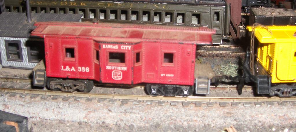 I've never been able to determine the story behind this car. It's factory painted brown over black plastic and appears factory lettered Kansas City Southern. As close as I can tell, Varney didn't offer this caboose after 1961 and didn't offer anything, ever, factory decorated KCS - where the GE boxcar uses an existing screen for data, there is nothing this could have come from and nothing it might have been re-used on. But it's even the wrong color plastic, pretty sure the others were all molded in that brown color, I have several others and the ones people have repainted all have been brown underneath.