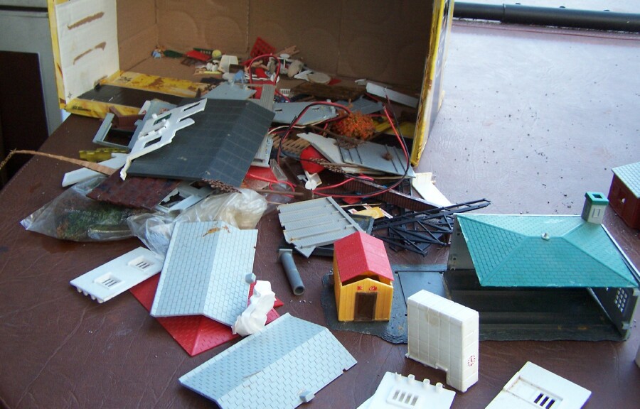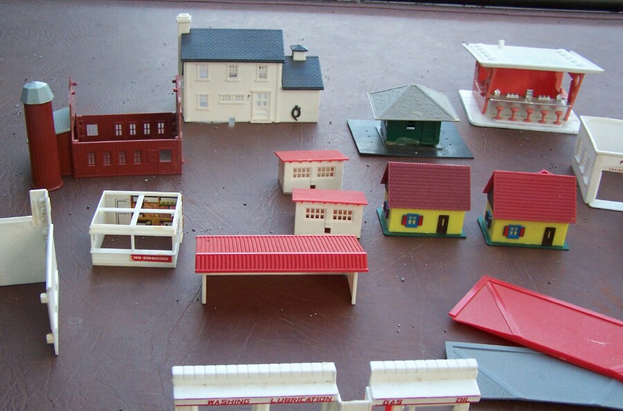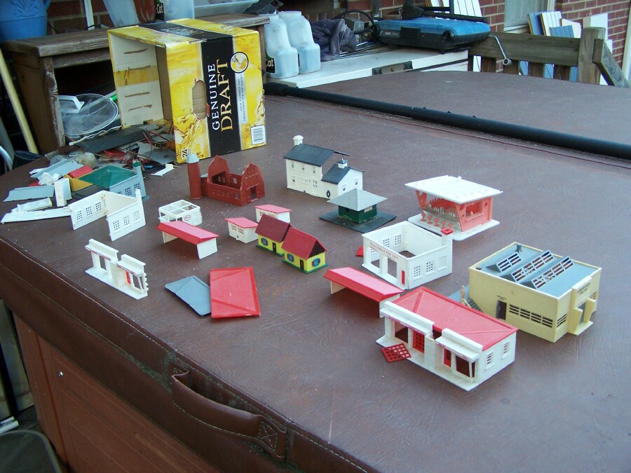 Today, I led my wife out to the Green Dragon, a rather large outdoor/indoor flea market in/near Ephrata, PA with a mixture of old country Amish vendors, and new with the typical plastic trinkets and T-shirts. I did find some good stuff, though. Stopped at one vendor and bought a Slot car police van, then while walking around his booth to the next, spotted a box of HO buildings on the ground, so I asked How much? He said $10 take it all. So I got about 10 decent useable buildings, some parts and pieces to make more, so I was happy. That was the only vendor with any train stuff I found model-wise, but one deal is good enough for me! Here's a few pictures of what I got.