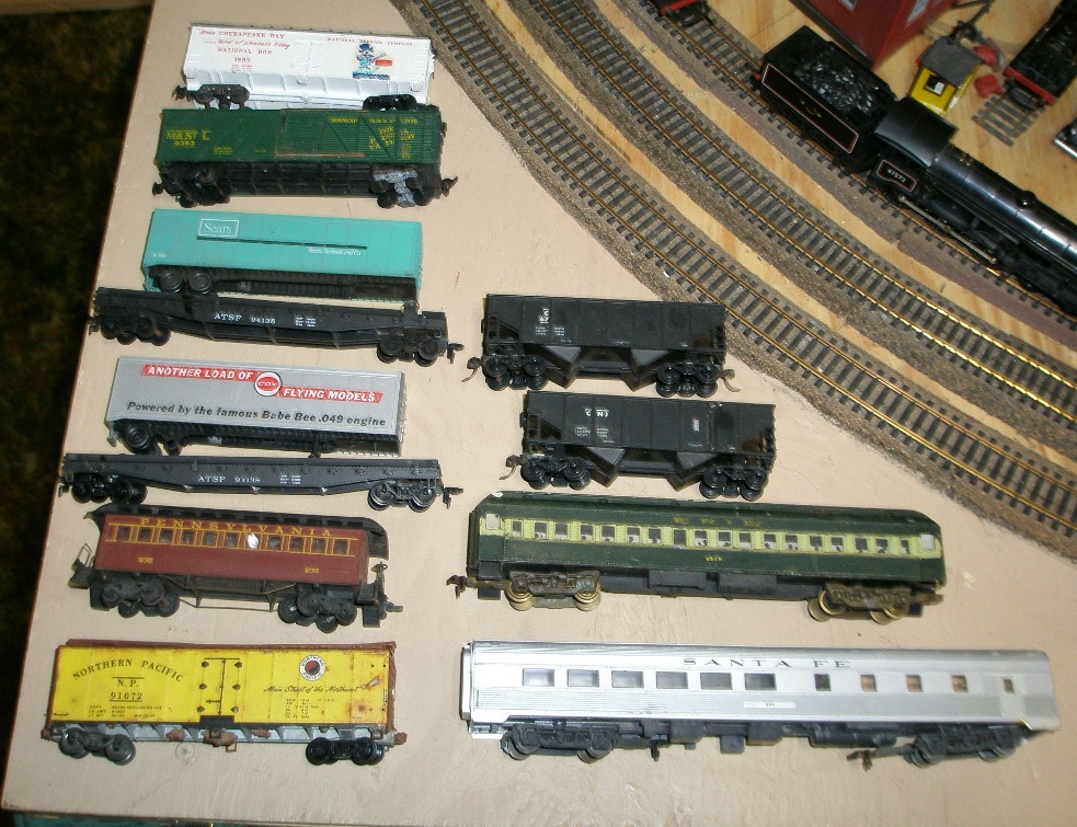 top to bottom. Varney beer reefer, AHM outside braced box car, Cox Sears 50' flat with truck load, Cox 50' flat with truck load, Mantua 1880 PRR coach, Varney NP reefer, 2 Athearn open hopper cars, Penn Line Erie coach, Santa Fe Pullman.