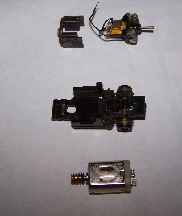 Having been bitten by the slot car bug again, I've been working on those, but this topic has caused me to start working on these older Bachmann Jeepsters as well. I took some to work yesterday, and I have found a replacement can motor at Radio Shack, 9v with 24,000 RPM no-load. REALLY runs smoothly! I powered it with a MRC power pack, and it stops accelerating about half-throttle, so I will probably add a resistor to keep the speed down, and not burn out the motor. :) I am trying to find my gear puller to remove the worm gear off the old motor, looks like the new one has the same diameter shaft, although a bit shorter. Should work OK, though. I've already modified the chassis of the Trackster, it should take this new can motor OK. It was only $4. It is worlds better than the original motor. I hope this works, would be awesome to get this DCCed with an N gauge Decoder, and run it at shows. Will keep plugging away at it.