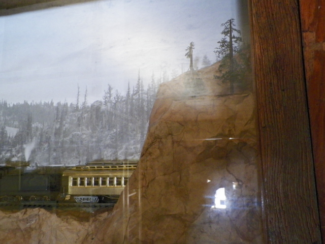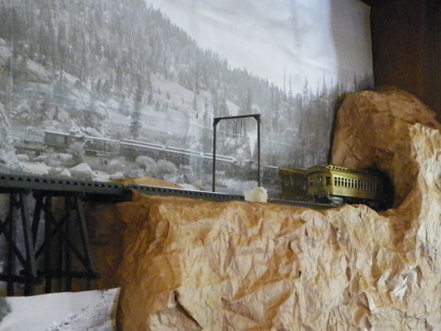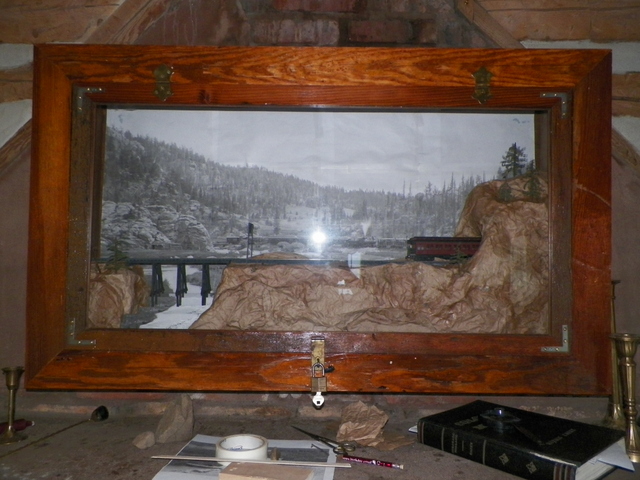 'been messing with that shadow box more and getting ready to go out in the shed and get my hands sticky again (pastin' the paper on). I've got mixed feelings about the way it looks right now, but I've got this vision of what it "may" look like when I get it fleshed out the way I see it (e.g., with trees and gravel and some grasses as with some of the rocky areas in the background photo). With these pictures you can see how crude everything is. The tell-tale is masking taped in place, though I think they're suppose to be at least 100' in front of the tunnel, so this one needs to move away from the tunnel. I need to figure out how to get the "ropes" on the tell-tale to be straight. And I'm thinking I need to use smaller bents on the pile bridge/trestle; shorter so it doesn't look like the train is so high above the water. Wh these particular pictures, I lifted the hinged glass front up and the background photo shows up pretty well. This particular canon does wind back and forth (if I remove the tunnel pullout, you can see the front engine facing you directly), so I'm trying to give the illusion that it just rounded another curve and is exiting through a tunnel. Some of these old excursion train pictures show 2 and 3 trains in a "caravan" of sorts (must be some railroad word for caravan?). Critiques are certainly welcomed and I'm looking forward to seeing photos of what some of you other folks are up to.