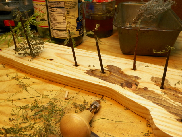 Been spending more time thinking about what to do than actually doing it, but finally came up with a way to make the trees. 1/8" balsa wood sanded round, dipped in stain and then polyurethane (the poly to strengthen maybe; balsa breaks easily), tiny holes drilled and dried yarrow glued in for branches and then sprayed with dull coat to hold it together. We will see . . .