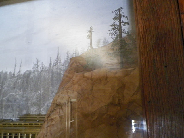 My apologies for the glare in the middle of the glass. This is just a current status photo. Realized I could add another dimension by attaching a couple rock outlines to the lift-able front glass panel. So I did. Added a couple trees and playing some with how to depict the stream under the trestle . . . so far what I'm doing is cutting out several copies of the same picture and then staggering them beneath the trestle. It will obviously not be realistic, but it may trigger the imagination?