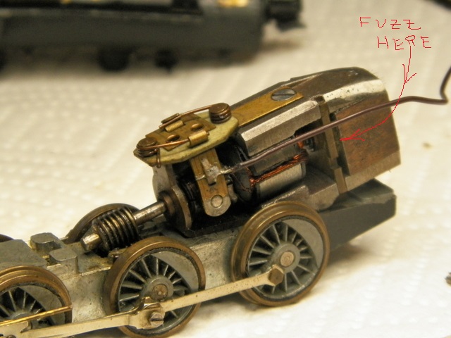 So . . . I'm cleaning up this motor from an early Mantua brass and cast 2-6-0 Mogul and I remove all this "fuzz" from between the magnet and the front of the magnet housing. Now I'm wondering if this was some kind of a felt pad that was supposed to be there to hold lubricant? Anyone know about this? Or is it just accumulated fuzz? Also, note the way the lead wire connects directly to the brush.