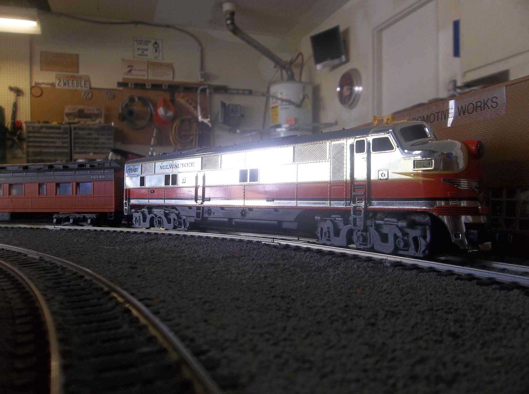 quote:After 7 long months of slow on off work, my TYCO Milwaukee Road E7 finally rides the rails again! Story behind it was back in January I won it off eBay, it was the perfect listing, In original box which was in good shape, Free shipping, described very poorly and or it was very poorly listed but because of that it made it a perfect listing for me , was in my state of California, and was for only $15 with one day left. Was considering some other things at the time but figured if I bid on this, I'm about 99% sure I'll be getting it, love the Milwaukee Road, love the color orange, love the shine it had on it so I decided, heck I would love to own it! So checked the next day and I owned it! It arrived within a couple days but unfortunately, the engine itself was a wreck. Filthy wheels, and whoever had it last, ran it hard and put it away wet, worse part was that it was rode hard on carpet...Found a lot of carpet fiber throughout the powertorque truck. Before finding all this out I cleaned all the wheels, lubricate the mechanical parts and tried to see if it would work, after it put on a smoke show I knew it would need a truck overhaul, similar to what I did last year with my Spirit of 76 Alco C430. So I took apart the bad front truck, started organizing the replacement parts and progressed gradually. The powertorque truck itself would be replaced along with the PT plate, springs, and brushes, and after today the front wheels to the truck. However I used bad springs and an incorrect style PT plate for that type of truck. So when reassembled it didn't work at all. Causing me to have to take apart the front truck AGAIN. Being I did not wish to sink more time into one engine I left it assembled and moved onto other projects for 5 months. Finally got back to it last month when I decided to take it apart and redo it properly having gathered all the parts I needed. Yesterday I soldered on the proper replacement PT plate and I spent this morning, installing the new springs, the replacement brushes, and screwing down the PT plate. Put it on the tracks and was so relieved to see it run again! However because the wheels it had on it's front truck were missing the traction tires, it wasn't running 100% so I replaced the front trucks wheels with ones that had the traction tires and now the E7 works like a charm!