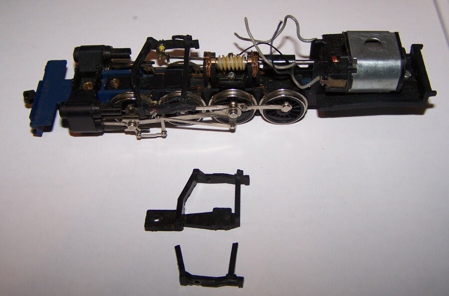 Well, i got the weight for the Tyco 917 in the mail at work today, and was eager to try it out. Once work was done, fire up the HHR and head for home! I started work on the engine about 10 PM, and was done in about 40 minutes. The frame on the blue Chessie chassis that attached the side rods was broken, so I had to take it off the chassis with the black front area I was gonna use, and put it on the blue front chassis. After sweating over removing the loc-tited screws, they came out of both units with no fuss. I swapped the parts, and then the tricky contact arms under the frame had to be JUST right. Got them in, then locked down the unbroken frame, then reattached the side rods. WHEW! My first side-rod surgery! Ok, maybe second, but this one was more complicated than the little Joe Docksider job. LOL!