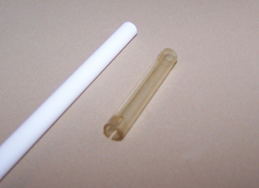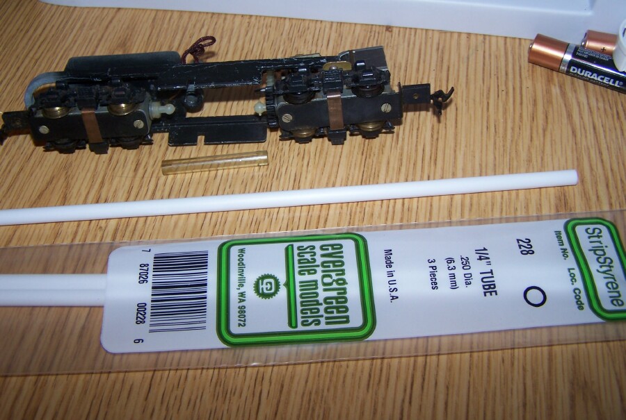 Anyway, it has an intact tube driveshaft, and I thought I could make those. I found some 1/4" diameter tubing #228 by Evergreen Scale Models at the nearby hobby shop from the train store, white, which looks to be exactly the same diameter and thickness of the original driveshaft. I will attempt to make some tonight, easy job. Easier than the Marx motor commutator pcb I am going to try to make! Anyway, I thought that someone had posted somewhere that they needed a driveshaft for their Varney diesel. If this is the same one, I will be glad to make extra's for anyone that needs them, I got 3 feet worth of the tubing, the original is 1.75 inches long and clear. These will be white. See the pictures attached -