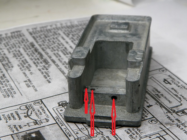 I was able to round up a tender shell for the 2-6-0 Mogul. Unfortunately no original trucks. But, I do have a question. It regards all the different holes that are seemingly "factory-drilled" into this shell. I know what a few of them are from the instructions that are on www.hoseeker.net, but with the variations over the years . . . so I've got this photo with arrows going to the holes that I'm unsure of . . .