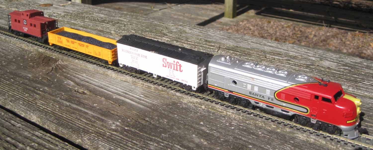 This came in a box of "stuff". No markings on anything except Made in Hong Kong. not 100% sure the Swift reefer, UP gondola and Santa Fe caboose went with the loco, just assuming they did. Believe it or not the loco ran after cleaning the wheels and the commutator, but it will not pull anything, the wheels just spin. All the wheels on the rear truck are traction tires, look more like O-rings.