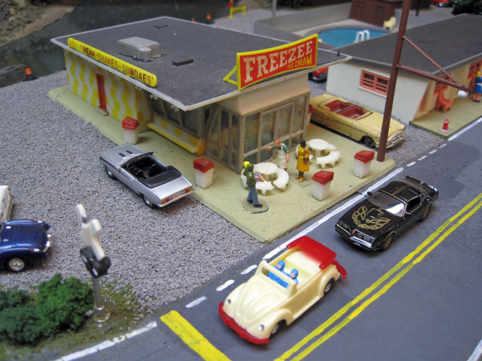 Hey! I'm sittin in front of Jnxt's Freezee in my black 79 Trans Am!! (I have the real version) I also see the Bachmann motel with pool beside the Freezee I'll add the Bachmann made home... I have only 2 or 3 Bachmann items total.