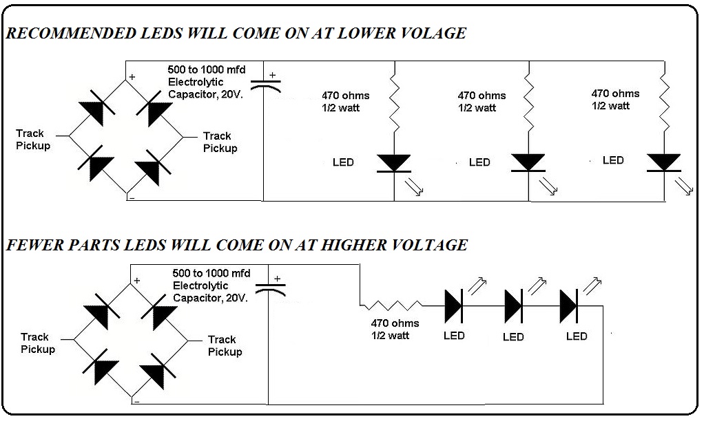 I will take your top schematic and Nelson's sage advice as my blueprint. The idea to make a benchtop test circuit is a good one, now that I am starting to get into more complex lighting projects, so I can get back to some cabooses and those Athearn RDCs and light them better (as well as in the first place).