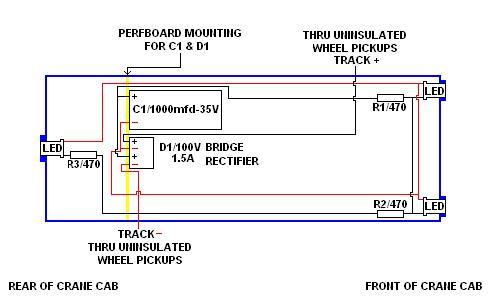 I want to bring the truck power wires up into the cabin floor (and have already drilled a hole in the round "turret" to do so) and solder them to two separate small brass pieces (left and right feeds from each truck) attached to the rear floor of the cabin. Then I want to attach the circuit properly to each brass piece so that the LEDs remain light whether the crane is moving forward or backward.
