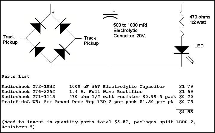 I found a 35V/1000mfd capacitor and a 100V/ 1.5A bridge rectifier diode at Radio Shack and will use either spade or mini 2-wire-connectors between the track + and - pickups and the bridge diode, to enable me to take the cab off the car base if necessary.