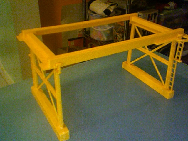 I bought this in a box of bits and pieces at my local hobby store. It is a yellow plastic thing which reminds me of a crane of some sort. It comes in three pieces, a top part and two legs, both of which legs have an I-beam at the top which slides into a T-shaped sort of hole on the top part. This is all that appears to belong to this thing, I am wondering who made it and what it is.