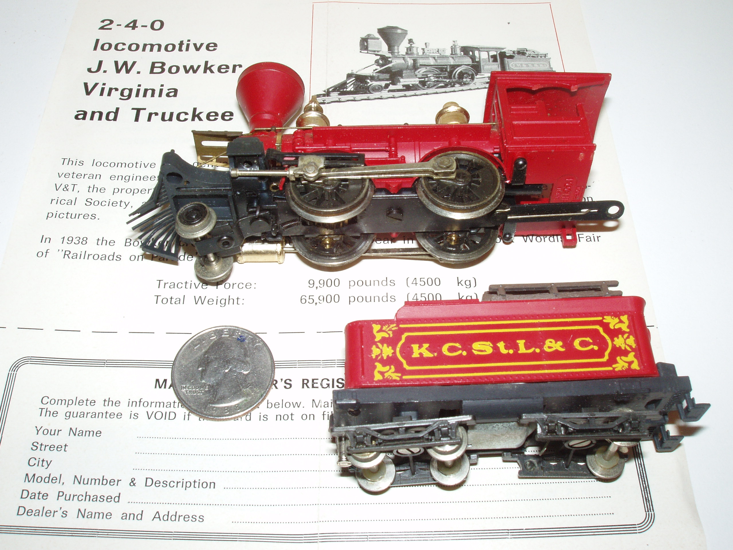 quote:Missing drive-shaft, light, 2 thingys on top of boiler, wheel for tender, not at hobby shop. Strong motor.