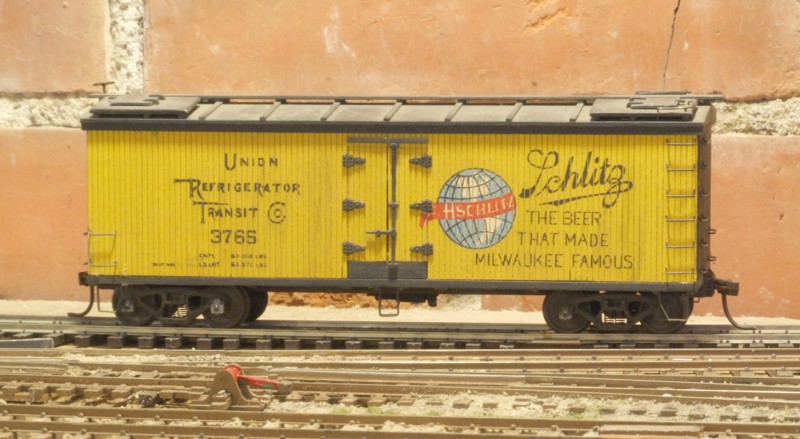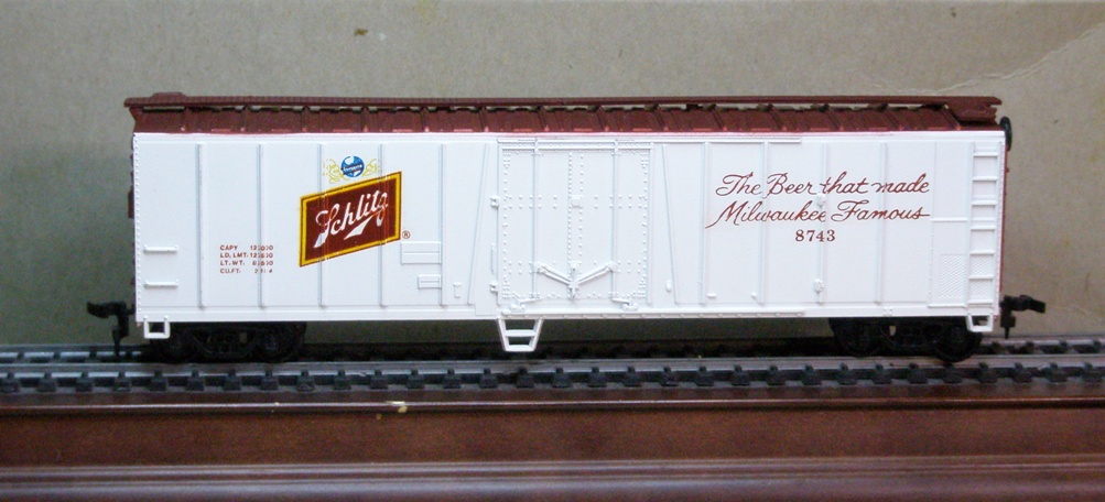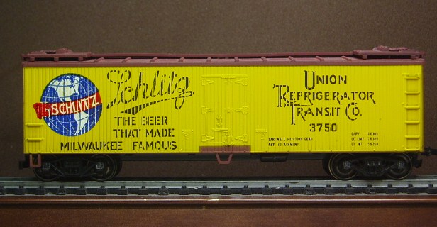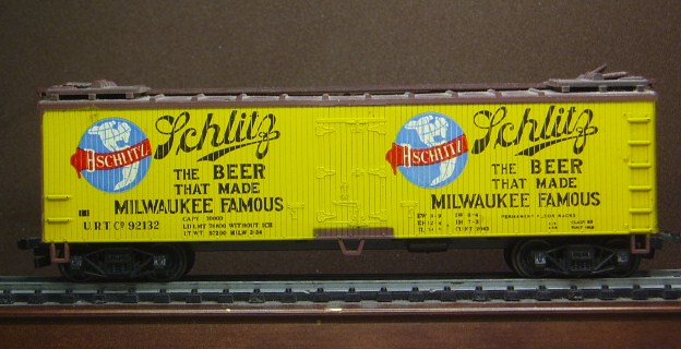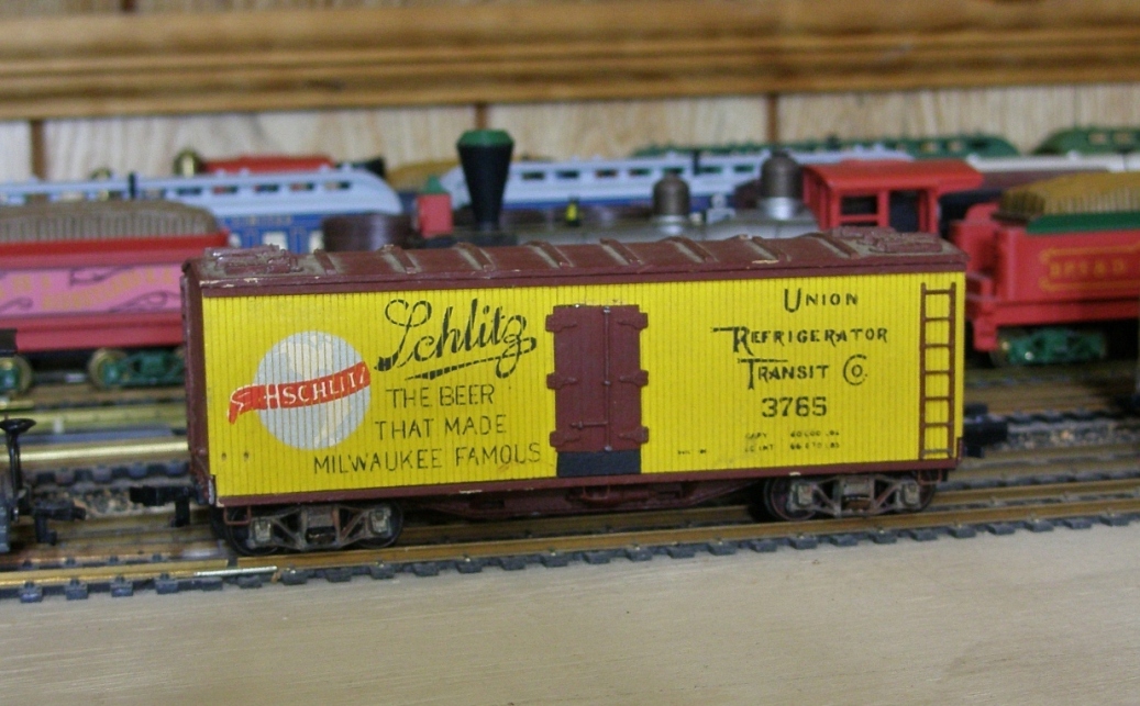 A Lionel HO Schlitz beer reefer