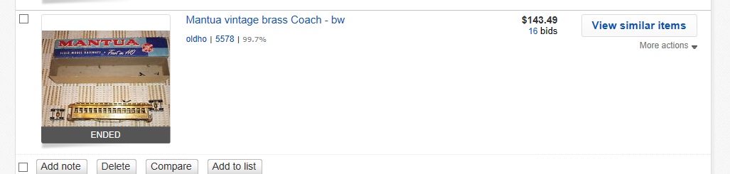 Check this out . . . this brass Mantua passenger coach sold for $140! I emailed the seller and he didn't have any idea why the bidding went so high (" the moon? "). Looks to me like somebody had "ants in their pants" to get one of these cars, hey?