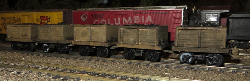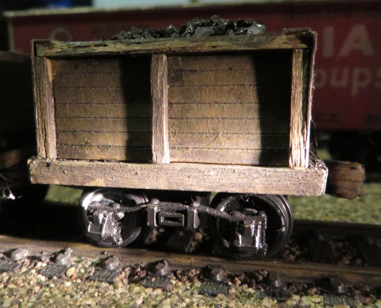 The floor of the car is a piece of 1/8" wood. The walls are made of file folder cardboard braced with old scraps of balsa. The cars are weighted with taconite pellets. Coal is glued in around the pellets.