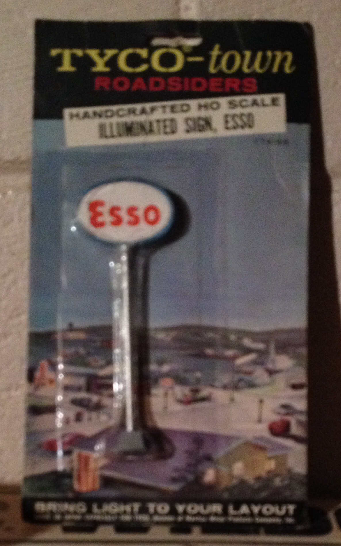 One of two lighted ESSO signs made by Tyco for only a year or two... Bought the Life-Like ESSO Gas station to use with these poles... Quite hard to find item ...