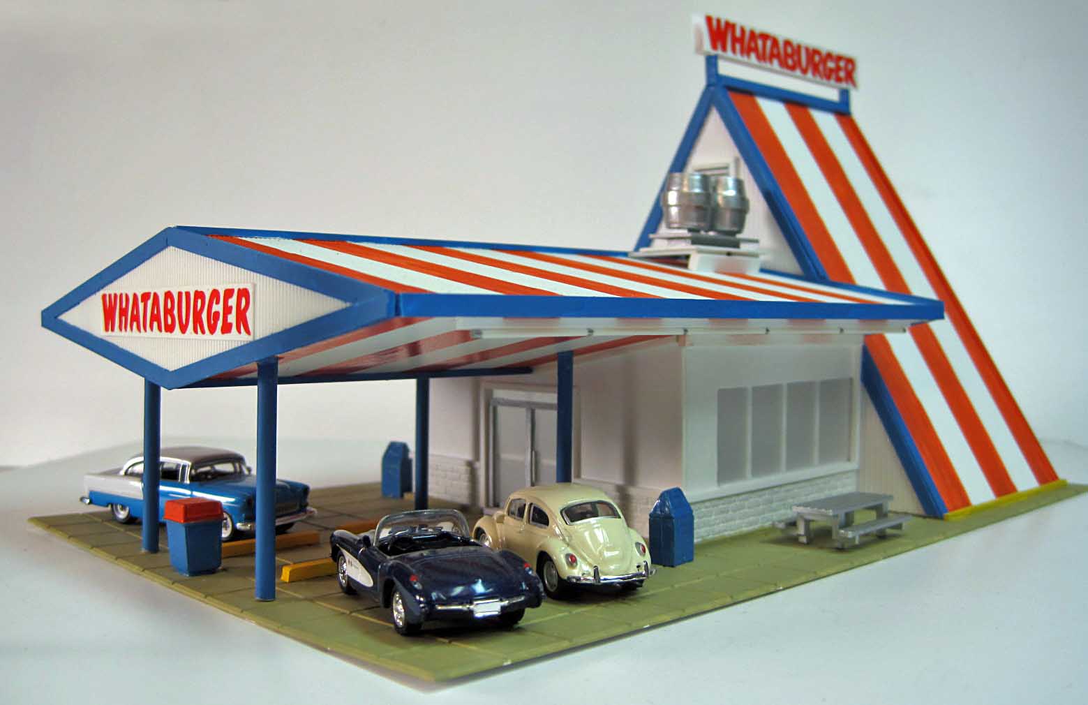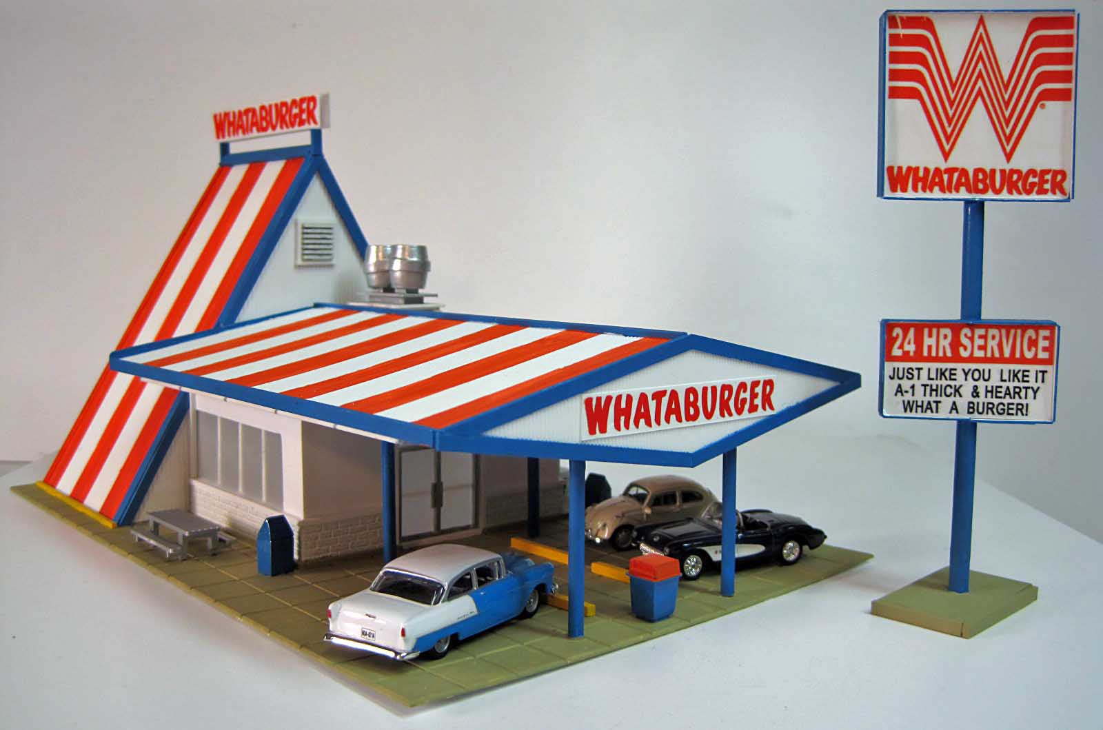 A very professionally done job. Did you scratch build this? I live in El Paso, Texas, and the city is rotten with Whata Burgers. Iconic as McDonald's. Sorry, I am not a WB fan, but your skill is exceptional!