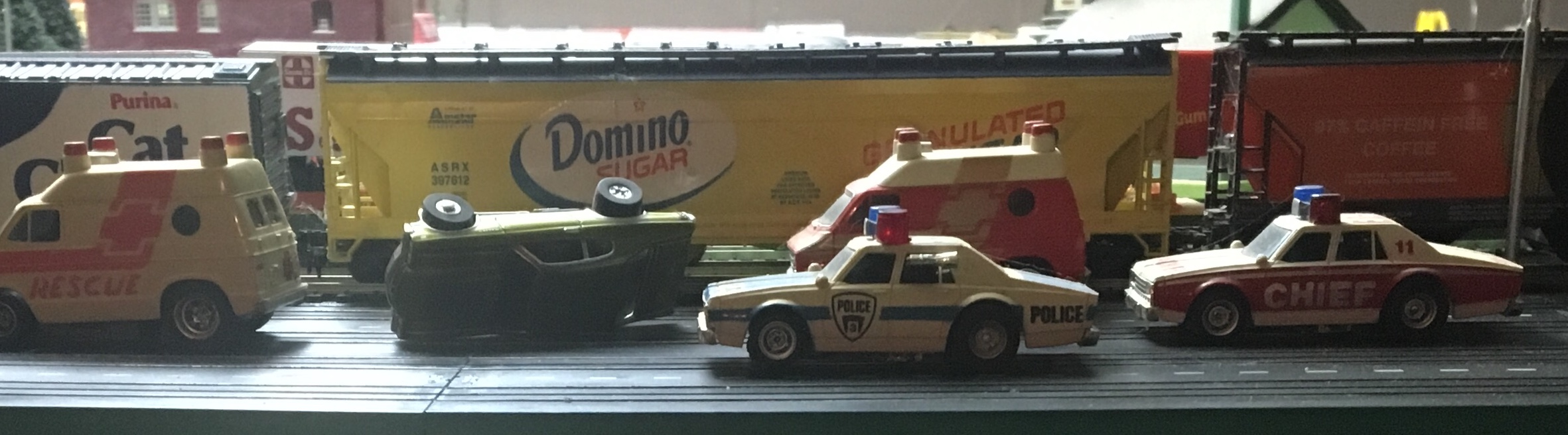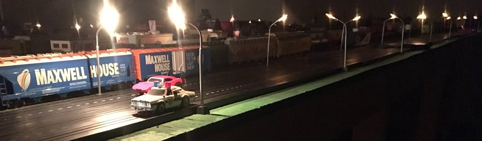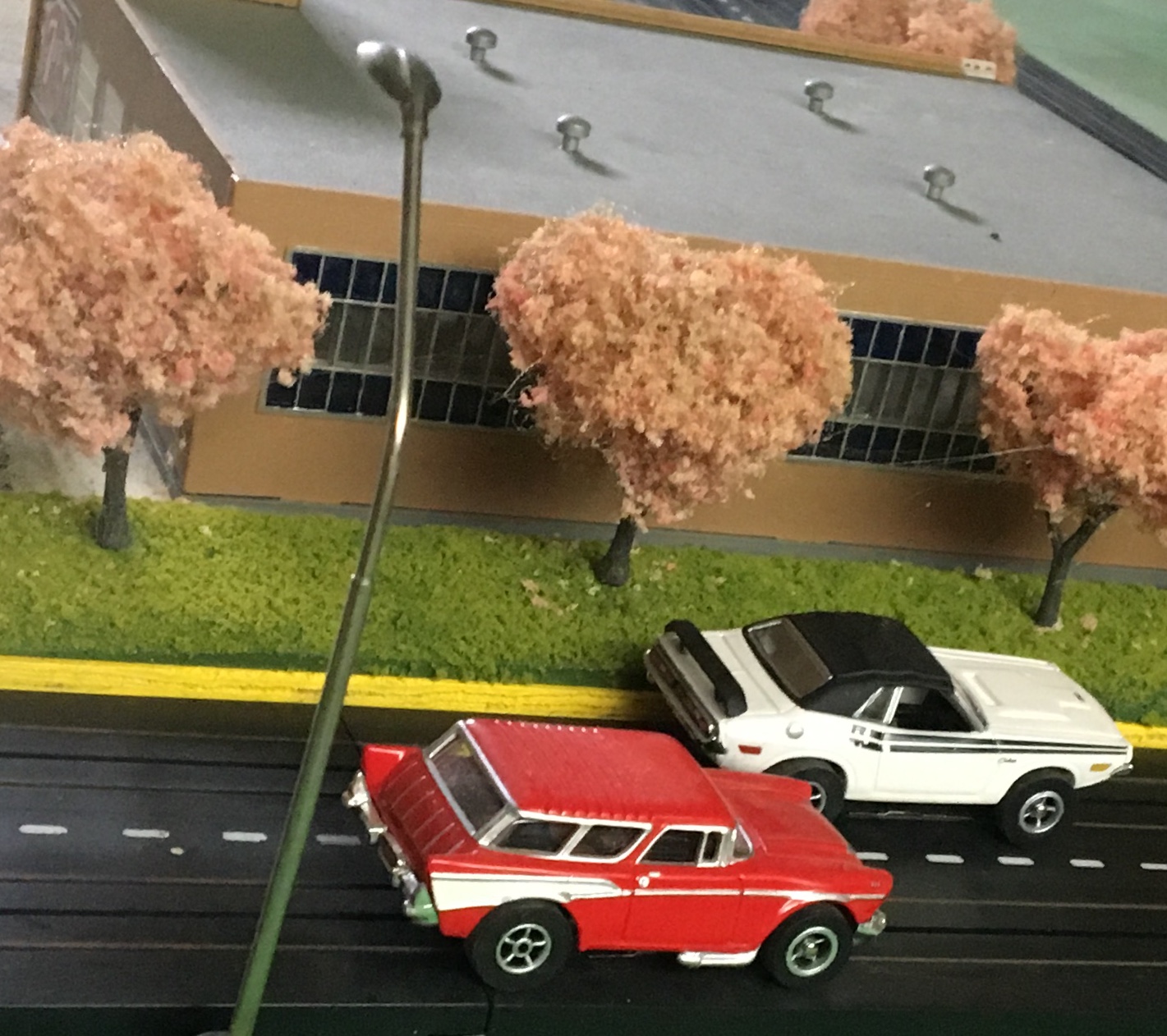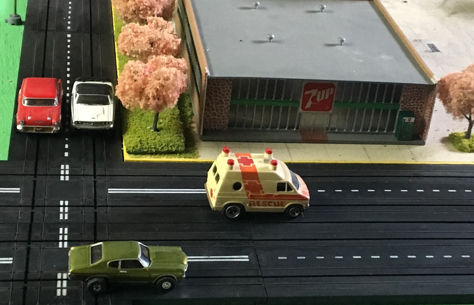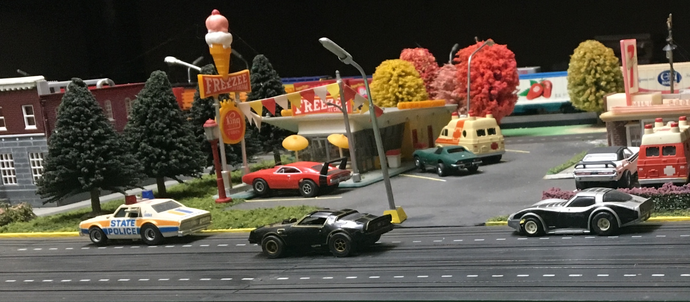 | Thank You, Brian... The slot car track is all old style Tyco made between1963 and 1977. The white painted detail come on the earlier pieces. It's two pieces laid side to side to make a 4 lane. It's not very popular track because the small connecting tabs on the ends commonly broke off. I used only good pieces and have plenty of replacements if needed. I have always favored old style because of the ability to double up the rail crossings and intersections...