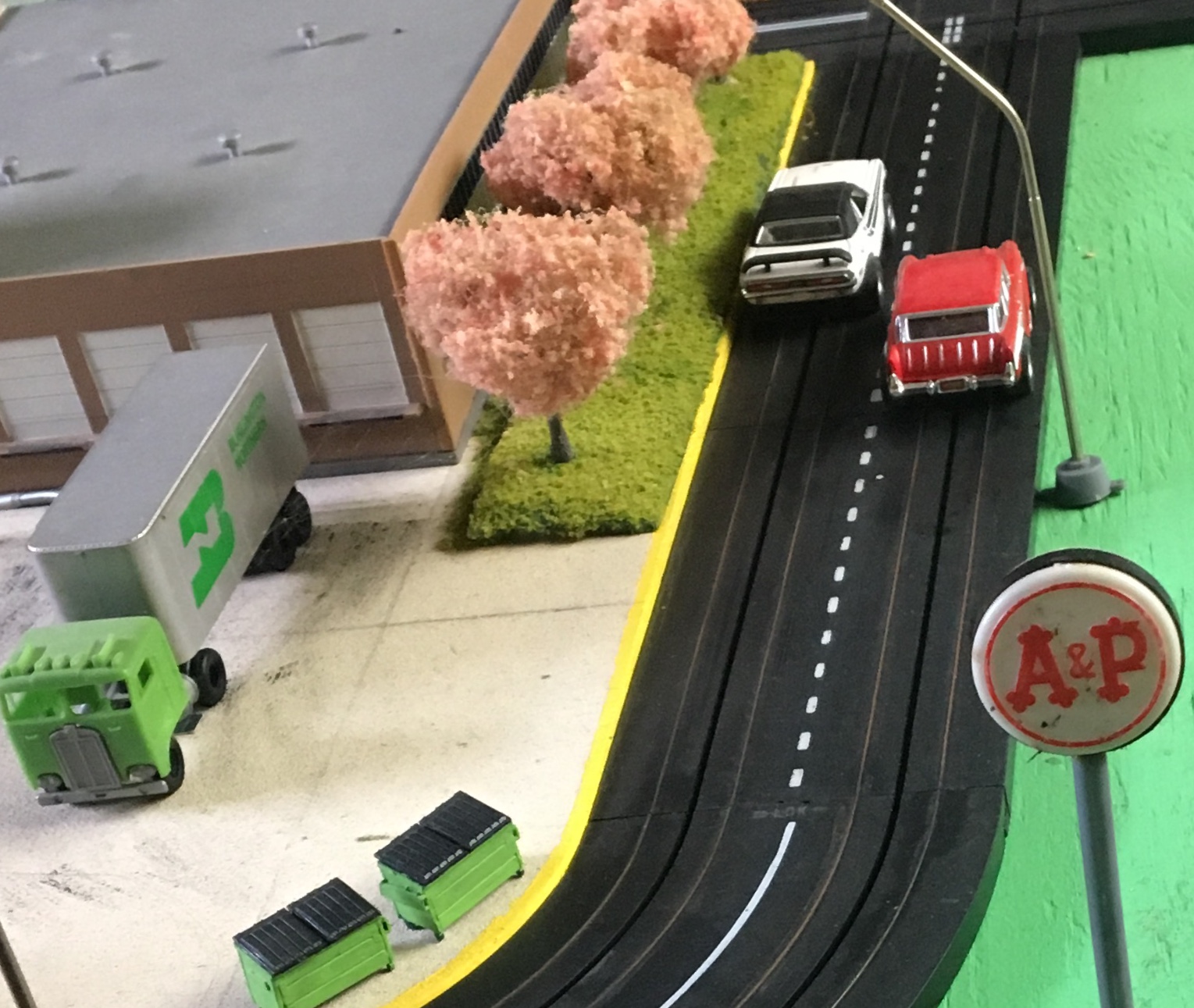 Thank You, guys... Redwoods, the curbs are done as shown in the photo. I cut 11/32 plywood to fit as nicely as possible then sand and use plastic wood until it is all correct. Then add the yellow paint... Once the wood working is done I can screw it down inside the slot car track opening... RP, The dumpsters are available ,they are little kits that you build and paint... Having fun with getting the new photos to post...
