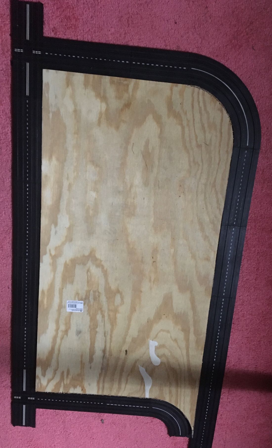 Trying something new here. Bought this 1/8 inch thick board which is the same as my slot car track. This is for the base to put the buildings on. This section does not have the 'curbs" unless I need to add them in spots. Several buildings on this piece so I will just have to think it out, what goes where...