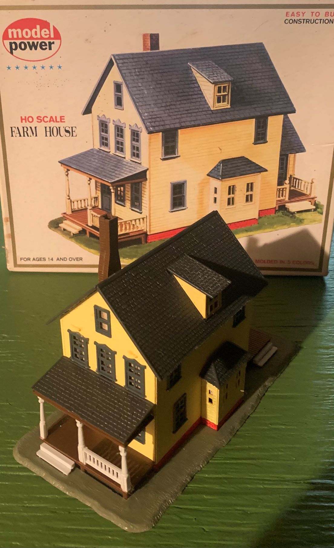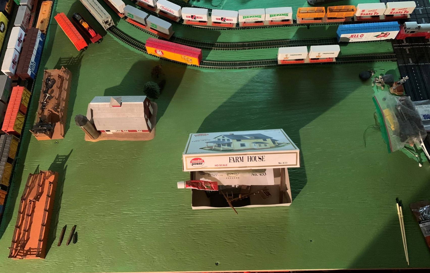 A tonight's photo of the farm area on one part of my layout. It's 4 feet from the first rails to the slot car track. Two feet wide. A total of 8 square feet and I have quite a bit of farm pieces including animals. This was a section that my first wife wanted from 1999. I kept the idea and the space for it. The Farm House can be seen in the one photo.