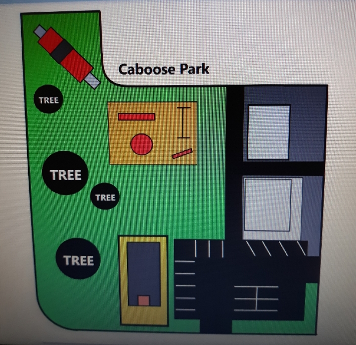 Then obtain some playground equipment, some trees, and an old Tyco Wide-vision caboose.
