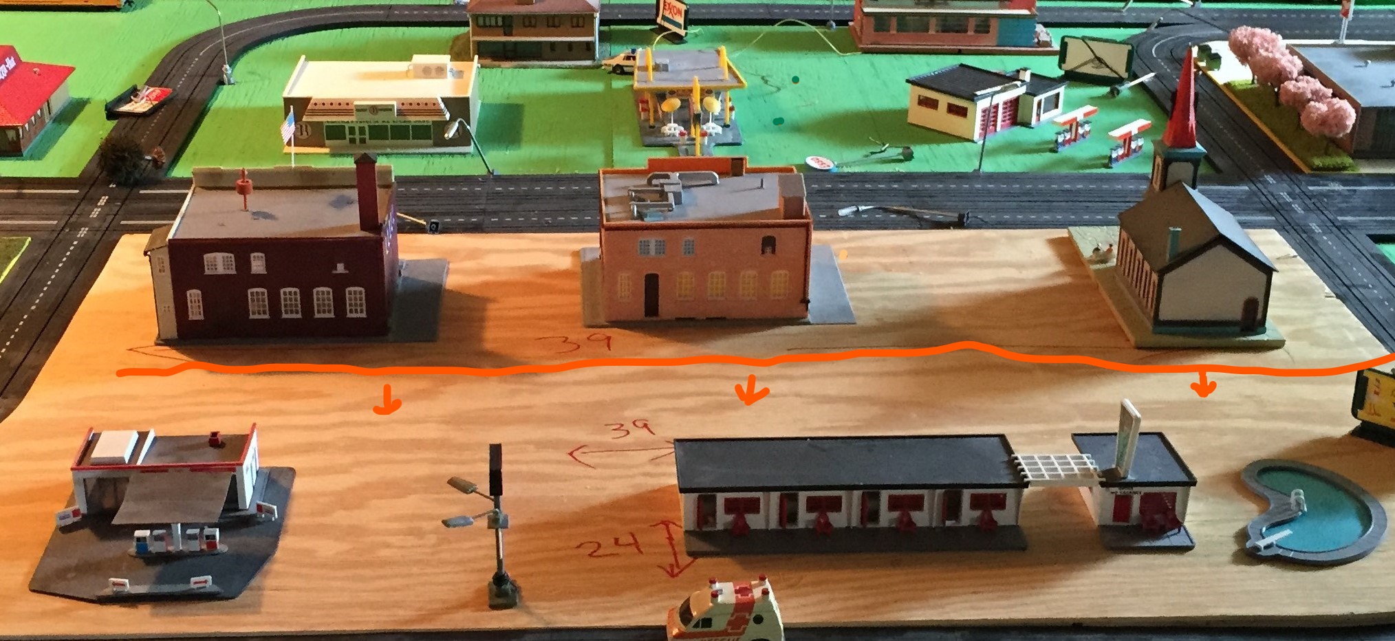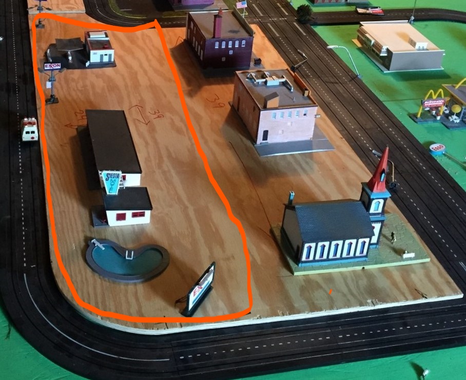 An older pic here from a couple of years back, and I just discovered while I was surfacing and painting the boards in this area that I have nothing to put in the area of the orange line towards the motel. I have used those two buildings elsewhere. I don't want any more buildings so I have quite an area of space to fill.