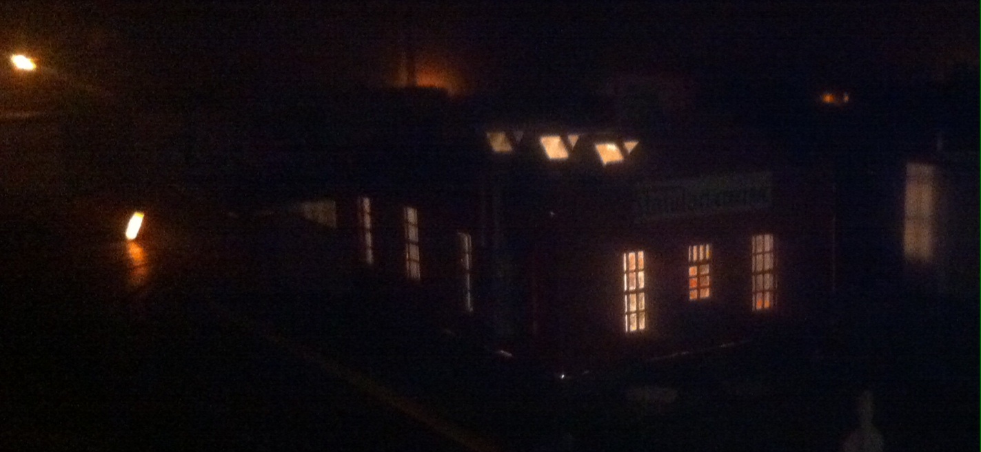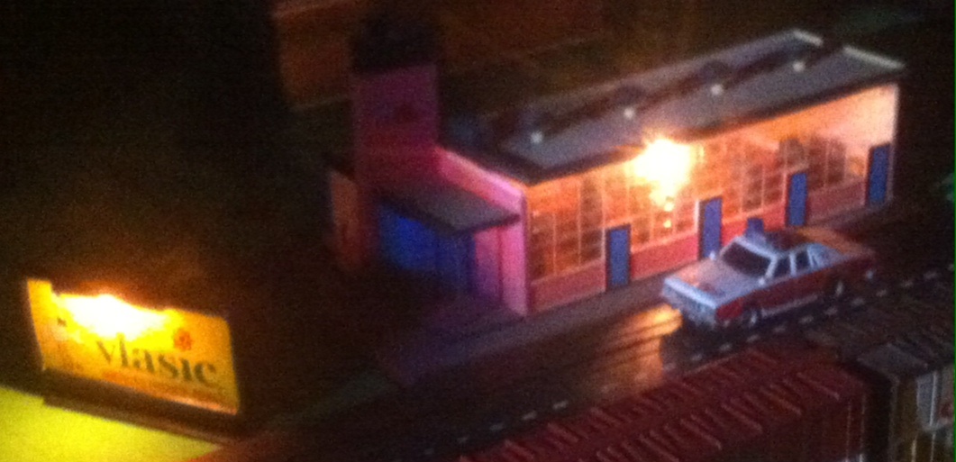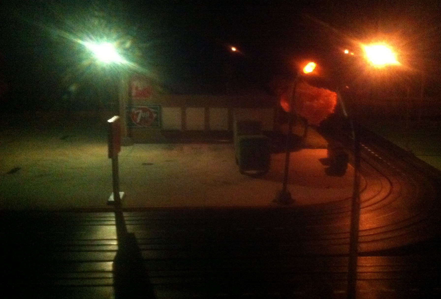 Lighting some building and poles on the block with the &-UP, KFC and the Machine shop. First pic of 7-UP the flash went off. The Tyco Mercury pole light is working here. It puts off a cool blue light that the flash ruined.