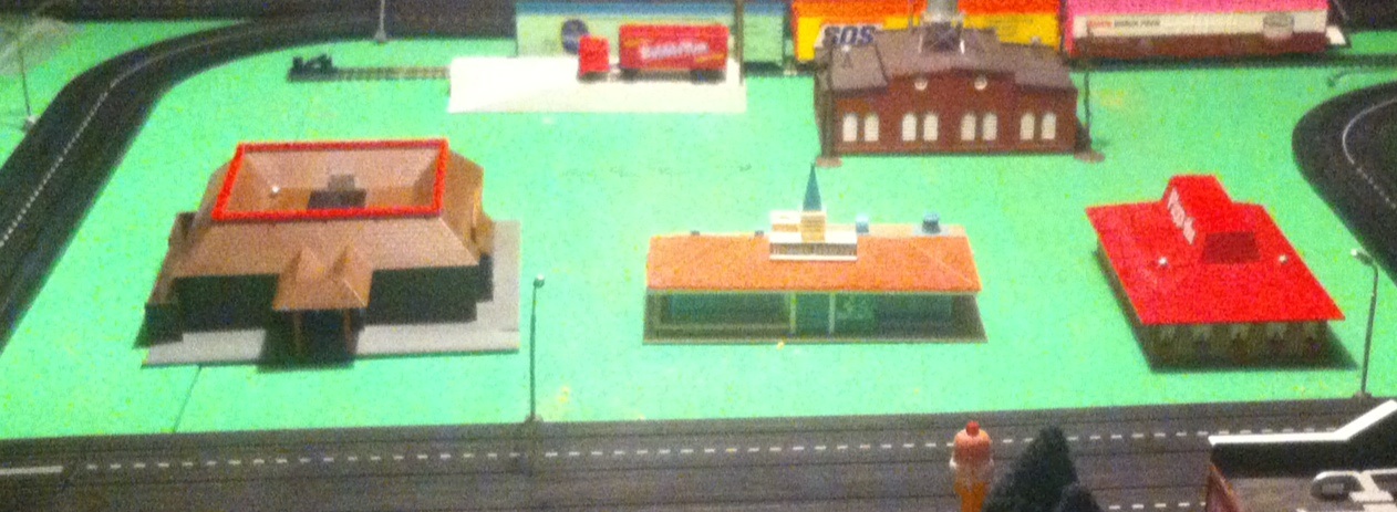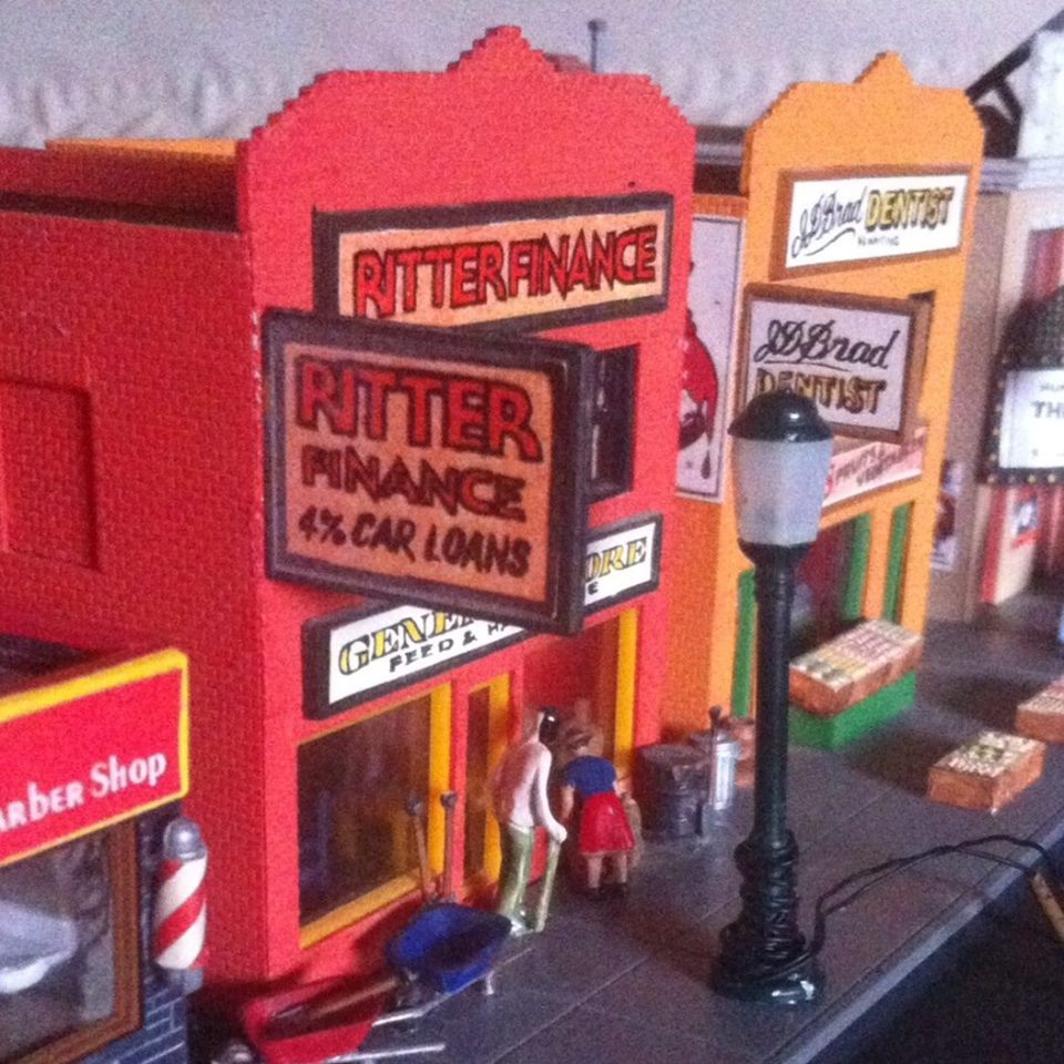 Thinkin' of doing this section with ground cover next. I have lights around the Cabinet Factory already. The Tyco restaurants in this section light up well except the HoJo's need a little light bleed thru work... Should be a neat section when done.