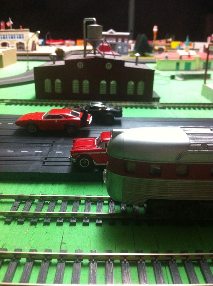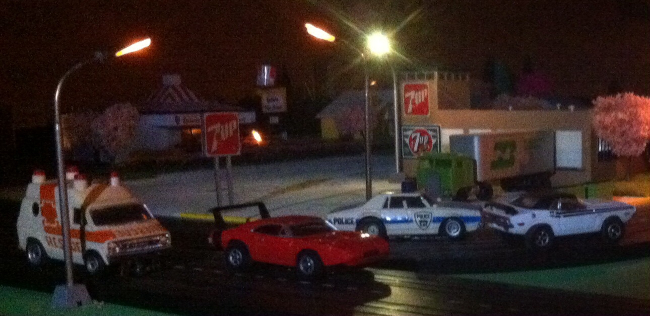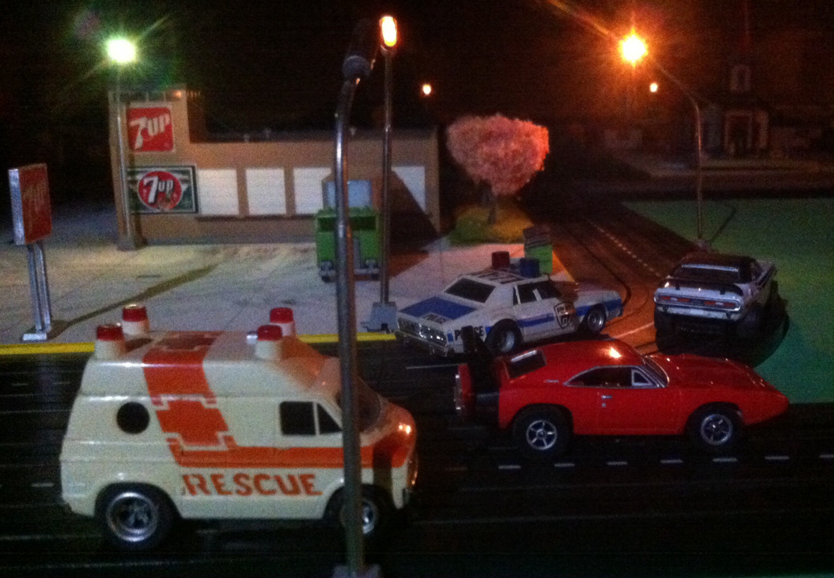 | That night shot with the Challenger and the streetlights is awesome. Makes me want to be standing in that room viewing the action. DCC for slot cars . . . screeching tires . . . shifting gears . . .
