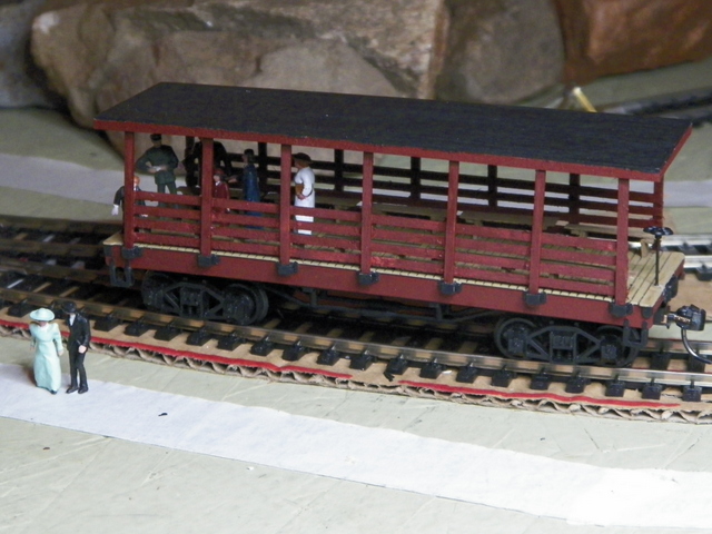 Not sure whether I've posted this excursion car before or not. I built the top excursion apparatus and the benches on an IHC or Bachmann flat car to replicate the one in the photo, but I've been shy on people (and you can see the ones in the photo of the original, the cars are pretty crammed full). So this photo of my car shows it populated a wee bit more. This is for that shadowbox that I've been progressing very slowly on.