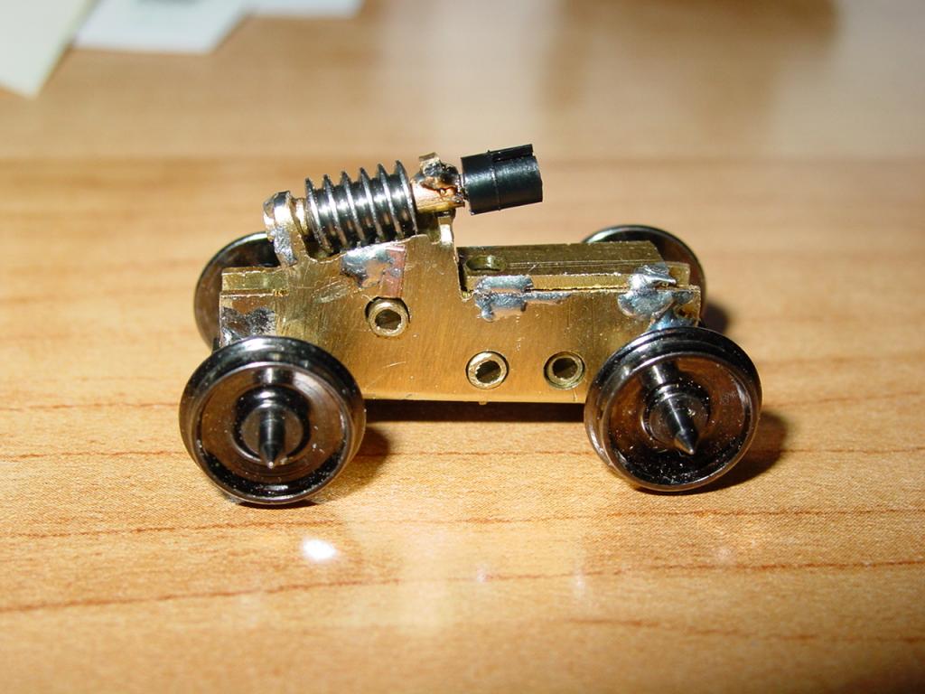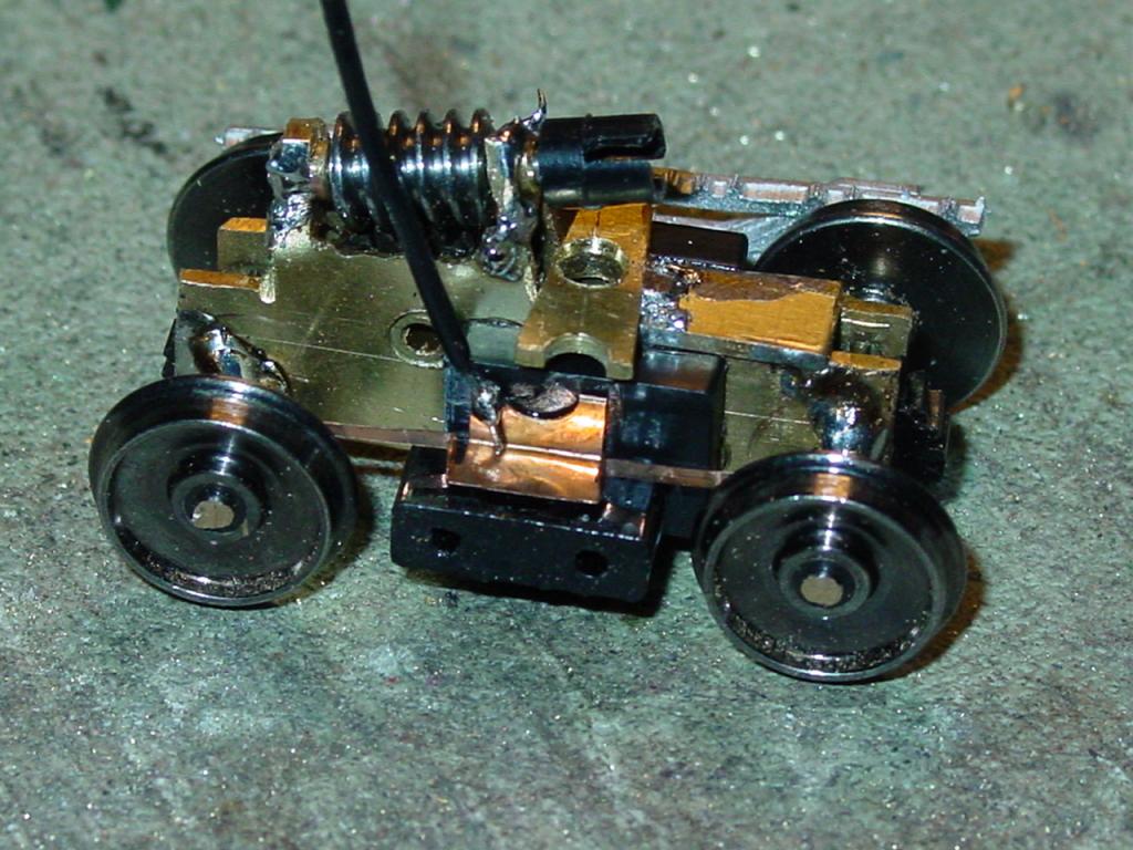 Truck #2 assembled! Half the electrical pickup is through the frame, and the other half uses modified Kadee centering springs as wipers. It's reliable enough that it doesn't even know when it's going over a switch. Only this truck has the wide bolster to stabilize the chassis, and the other truck is more free floating for some equalization on rough track.