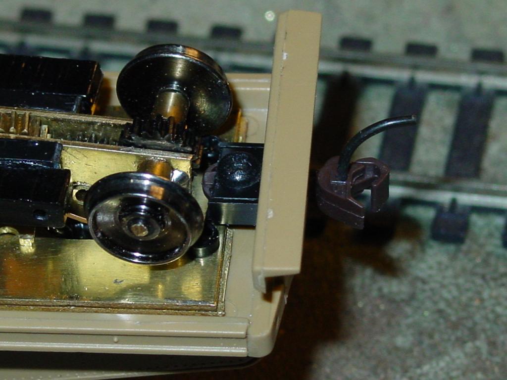 One coupler mounted! Because of the tight spacing, I can't use standard Kadee couplers. Until I get some Whiskers, I've got a Bachmann (McHenry) in there. The mounting height is perfect according to a Kadee height gauge! Again, plastic screw in a 2-56 hole tapped through the shell.