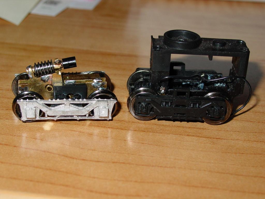 Here's the finished truck (minus paint) next to a Bachmann truck with the motor removed. Quite a difference in size! The NWSL geared truck should also run smoother, and the size difference will allow me to add more weight.