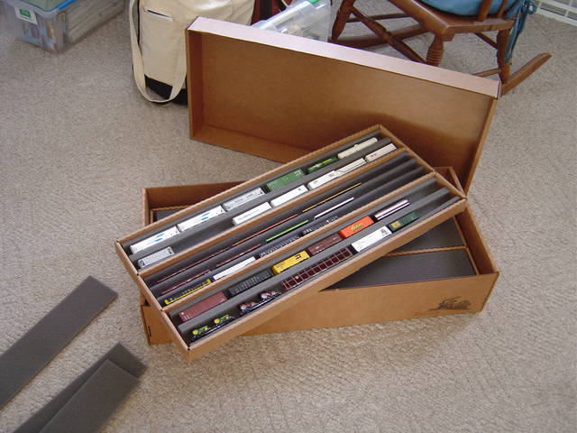 I've started using new/clean PizzHut Boxes. Large for rolling stock which hold 12-16 cars and usually small for 4 locomotives each. I put in bubble wrap (small) to act as buffers. The boxes are really strong. I have 4 all metal locomotives in one a small awhen closed I can hold it by the corner without any overt flexion. The boxes are about 35cents each. BTW: this refers to items not in their own original boxes