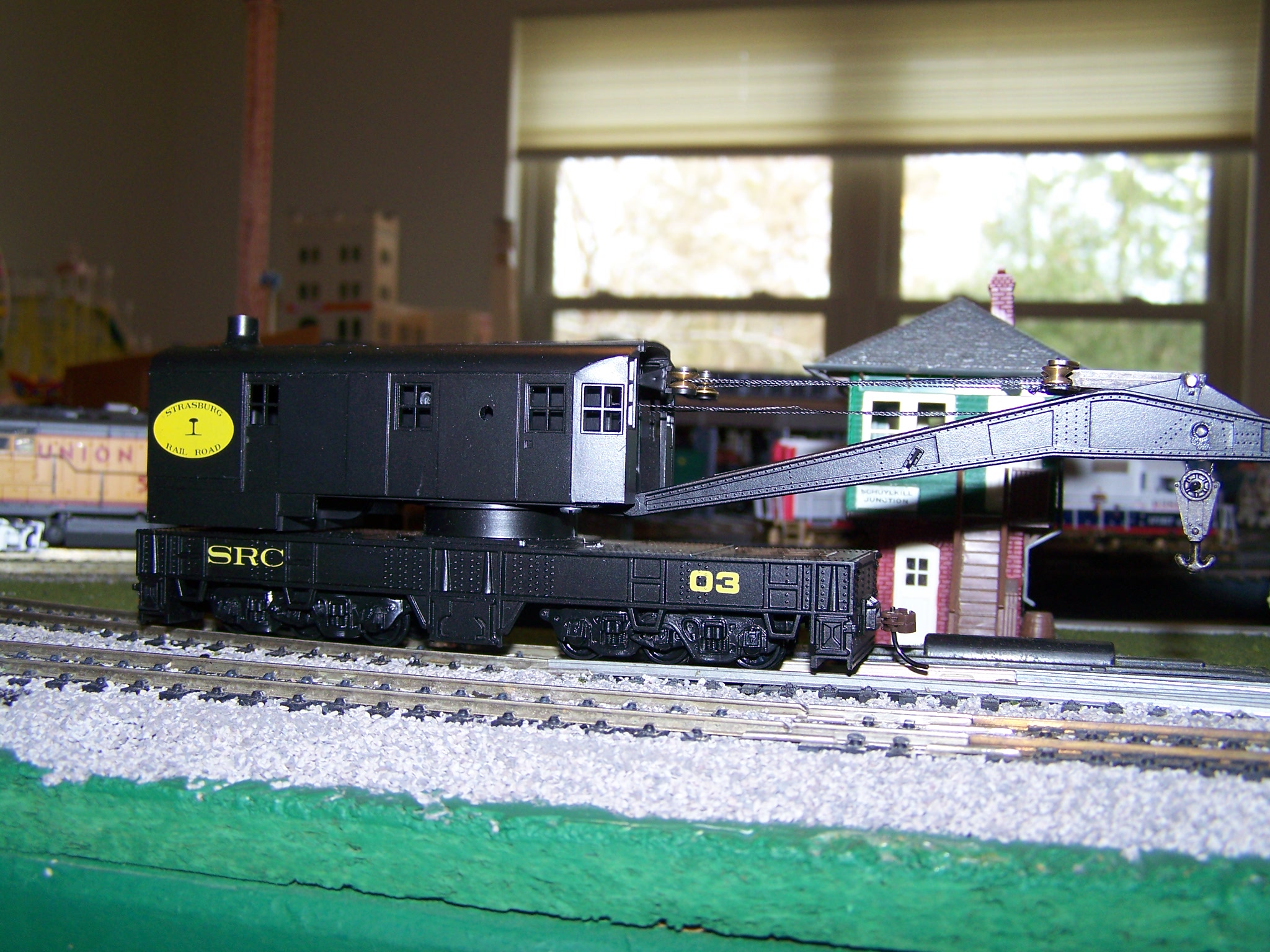 I bought this Athearn Strasburg Crane car since I used to live 30 miles or so from Strasburg. It was unassembled and made a nice project, the assembly instructions were not included. I got them off of HO Seeker, stringing the hooks was fun too. I found a boom tender for it too, just have to finish the paint and make a few decals.