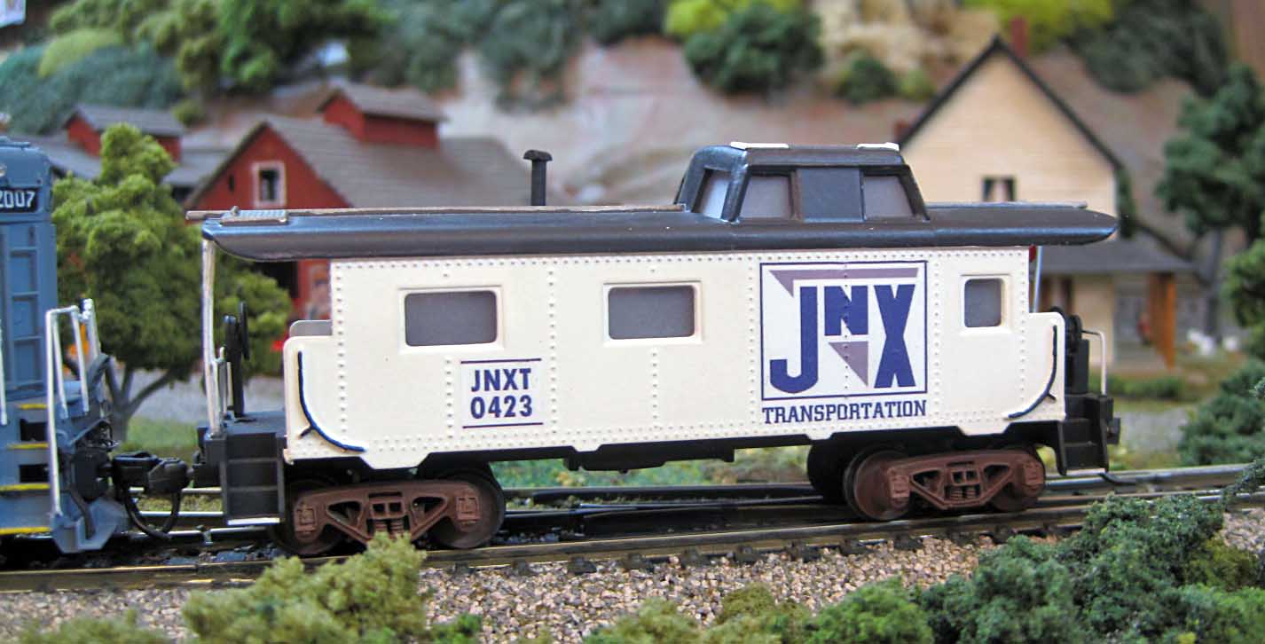Now, on the SD24 I decaled, I masked and painted a white square for the white decal to sit on so it would be nice and white. Or I could have even used a clear decal film. But any time you have an image with white in it, you have to print on white decal paper or paint a white space. On the caboose it didn't matter, since it was painted white. On the passenger cars, the little JNX logos were on white paper, and the JNXT black letters were printed on clear, so the silver would show through around the black letters.