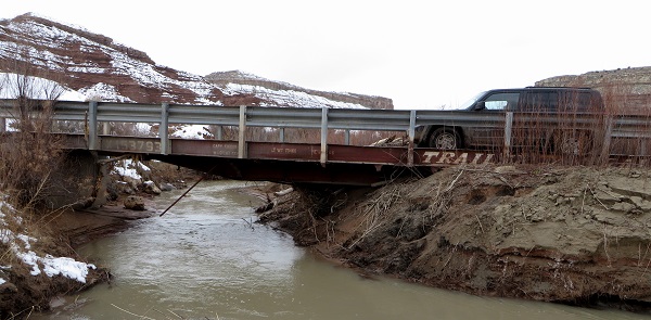 I've seen the bridge done more often with flat cars. Here's Willow Spring Wash Rd. crossing Muddy River in rural Emery County, Utah: