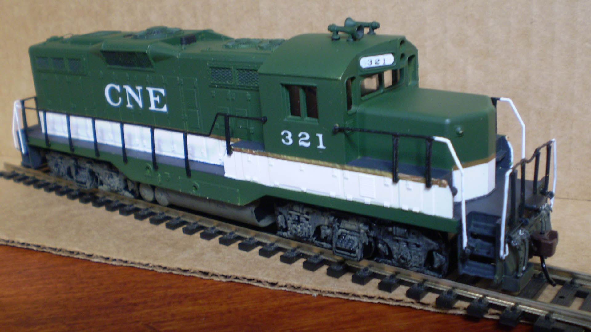 This is a Walthers GP9m that I modified by adding pilot boxes for the air hoses, a divided windshield, free standing grab irons and flush numberboards.