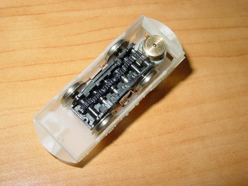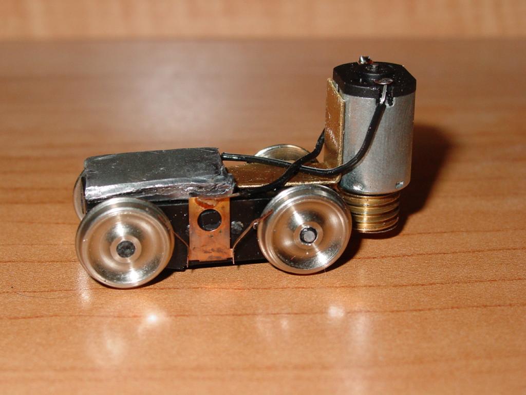 It's a modified Bachmann 44-tonner power truck, with NWSL wheels, the incredibly tiny yet powerful 1215D-9 motor, and some Kadee springs for wipers. This is the original defective truck from my Mack 15-ton project (on the MRR forum), but I was able to semi-repair the gears, tune it just right, and strengthen it with solid axles and metal axle bearings. It's not a perfect runner, but it's still pretty good!