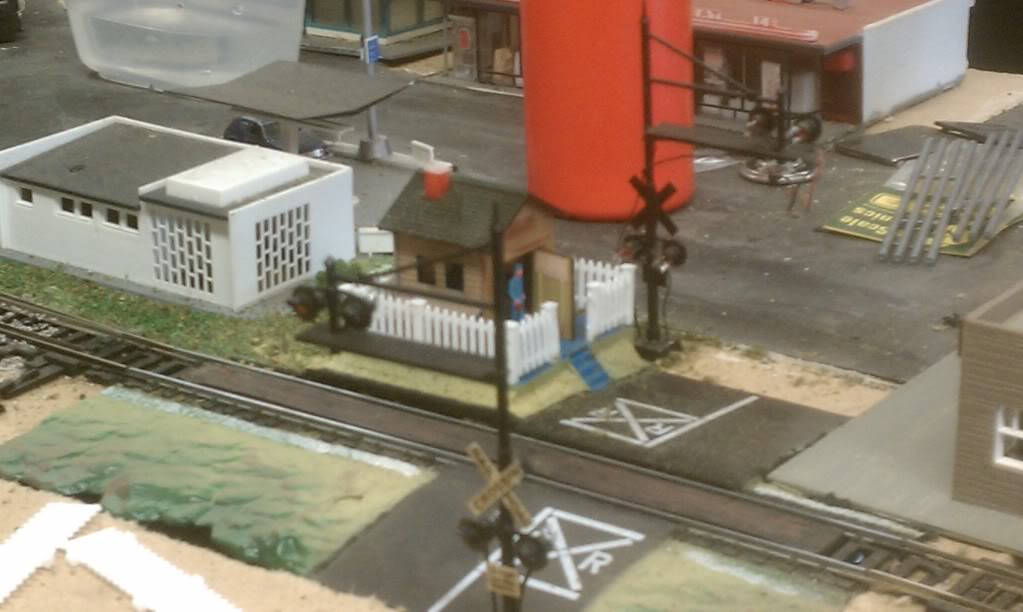 and today I start with a slightly rebashed Tyco grade crossing. Rebashed as in I put new fencing up around the signalmans shack. The "new" crossing lights work but the pressure plate doesn't I'll probably work a servo or an Atlas switch machine to get Ol' Bert to hop out and check on the train, the other sad thing is the light bulb fell out (its keeping Bert outside!) and I have no clue how to put it back in!