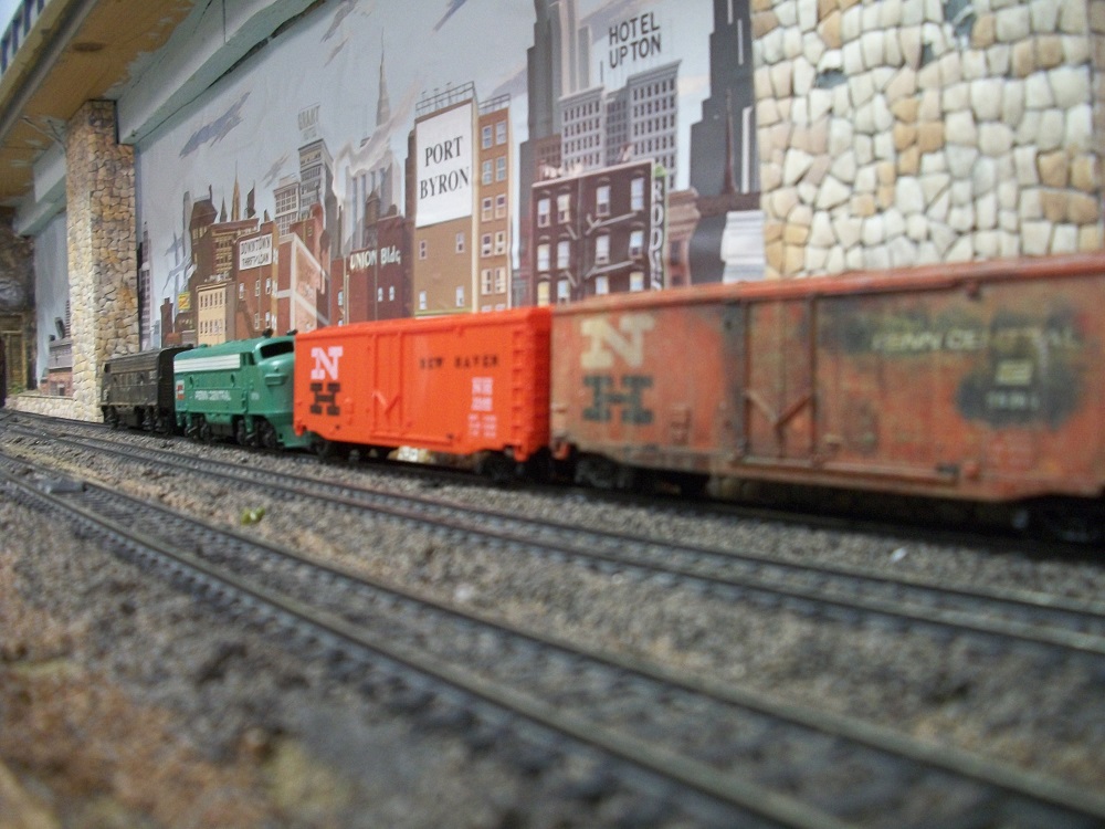 Chops - I love the look of that consist, even if the green PC F7 isn't 'prototypical'. As for trashing the Tyco NH boxcar - well I understand not wanting to deface a nice Tyco (I have zero tolerance on my layout for graffitti) but still, it looks very realistic with the PC patch job