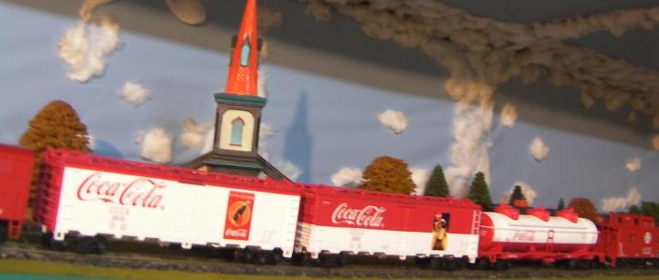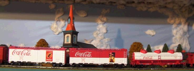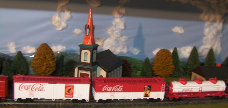 Shown are several Coca Cola freight cars made by Athearn. . .